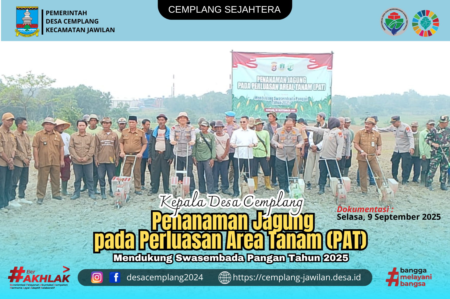 Cemplang, 9 September 2025 – Kepala Desa Cemplang bersama MUSPIKA Kecamatan Jawilan serta para petani melaksanakan kegiatan penanaman jagung pada program Perluasan Area Tanam (PAT) seluas 20 Ha di lahan pertanian Desa Cemplang. Kegiatan ini dilakukan secara simbolis oleh Kepala Desa Cemplang sebagai bentuk komitmen mendukung program pemerintah dalam mewujudkan swasembada pangan tahun 2025.