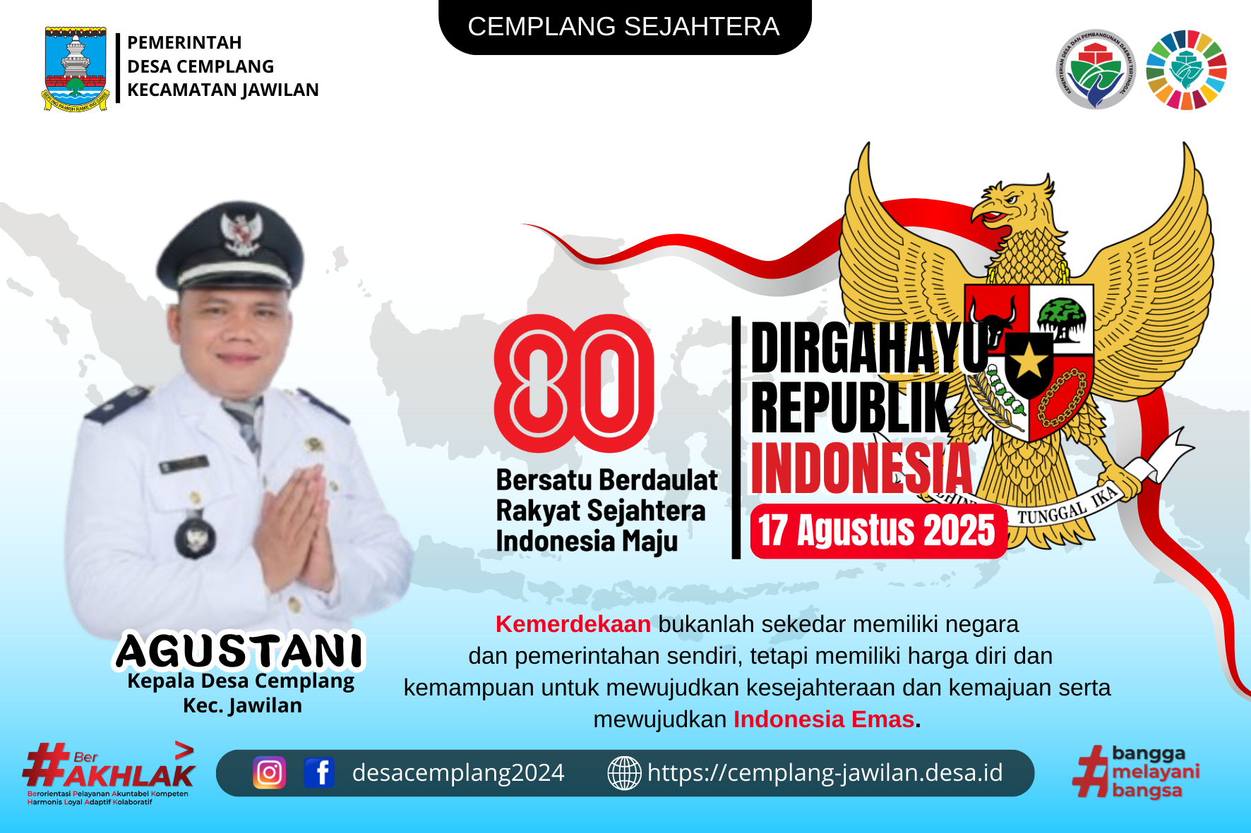 Dalam rangka memperingati Hari Ulang Tahun Republik Indonesia ke-80 yang jatuh pada 17 Agustus 2025. Bpk. Agustani, Kepala Desa Cemplang menyampaikan ucapan selamat sekaligus ajakan kepada masyarakat untuk terus menjaga semangat kemerdekaan.