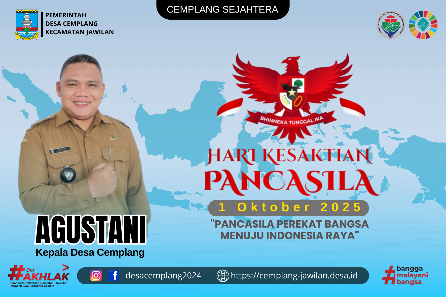 Cemplang – Dalam rangka memperingati Hari Kesaktian Pancasila yang jatuh pada 1 Oktober 2025, Bpk Agustani selaku Kepala Desa Cemplang menyampaikan ucapan selamat sekaligus ajakan kepada seluruh masyarakat untuk terus menanamkan nilai-nilai Pancasila dalam kehidupan sehari-hari.