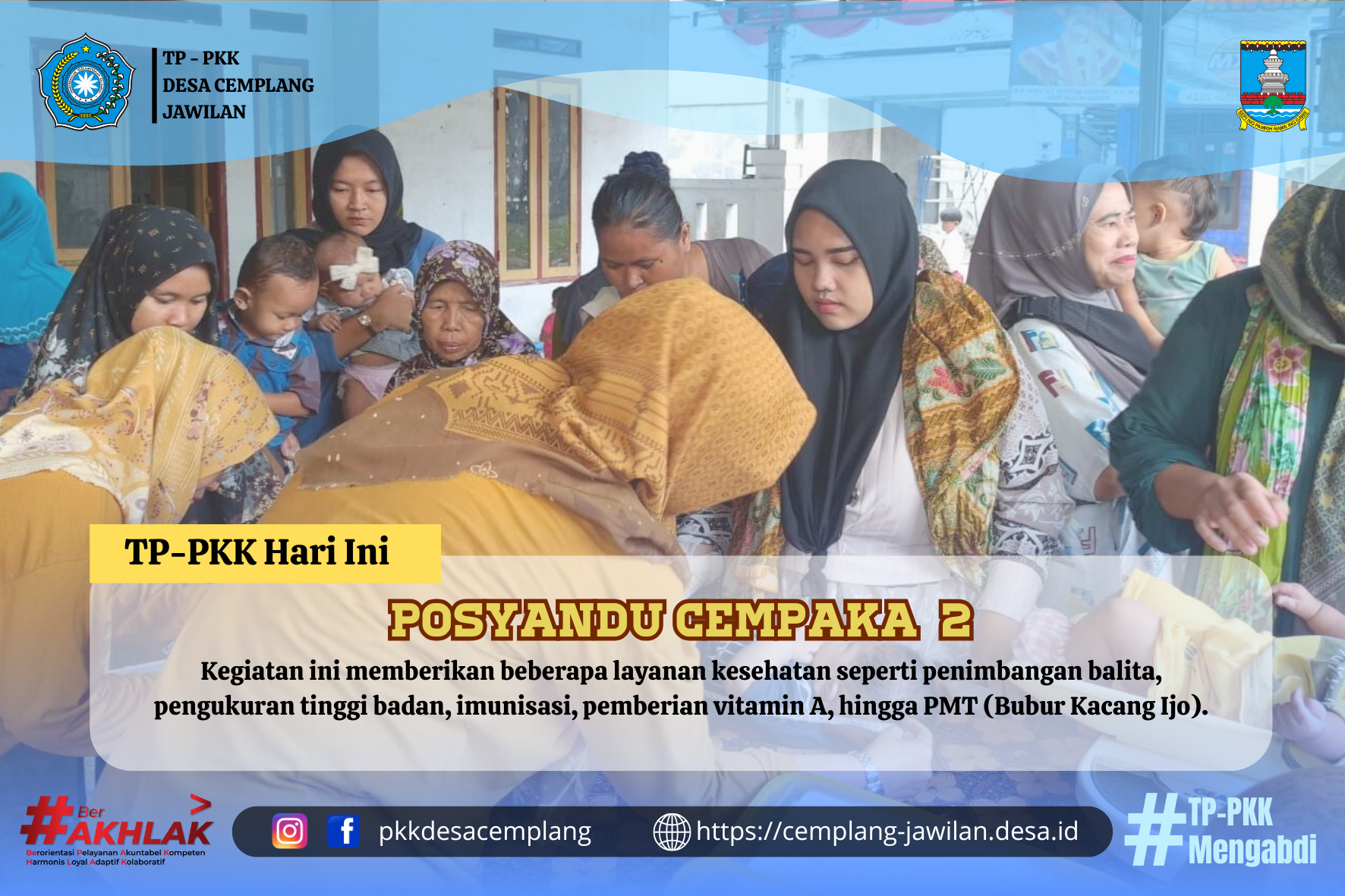 Kegiatan ini ditangani langsung oleh Bidan Desa Cemplang yaitu Ibu Novi Yanasari, S.Tr.Keb.,Bdn. dan dibantu kader Posyandu Cempaka 2. kegiatan ini memberikan berbagai layanan, mulai dari penimbangan balita, pengukuran tinggi badan, imunisasi, pemberian vitamin A, hingga PMT (Bubur Kacang Hijau).